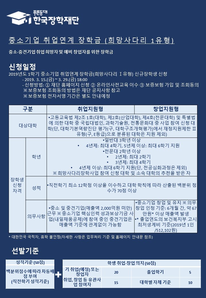 교육부와 한국장학재단에서 중소기업, 중견기업에 취업하거나 혹은 창업을 원하는 대학생들을 위한 장학금입니다!