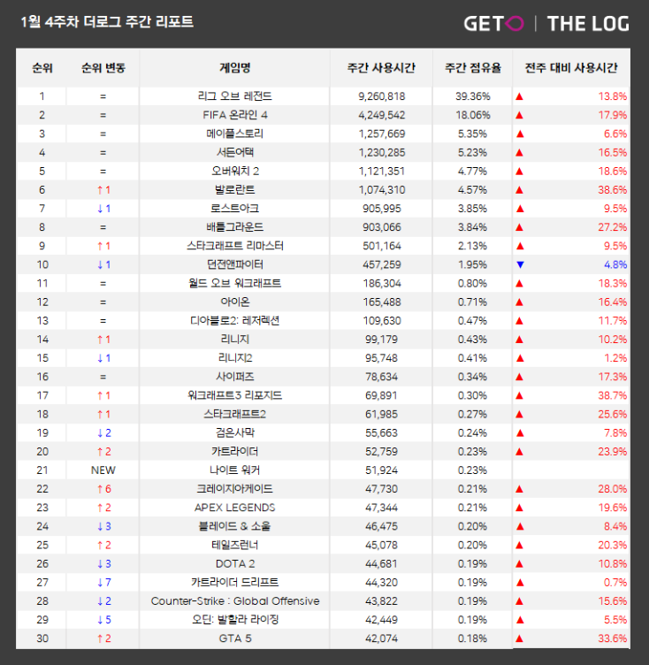 ◎ 발로란트, 사용시간 38.6% 상승하며 6위 진입