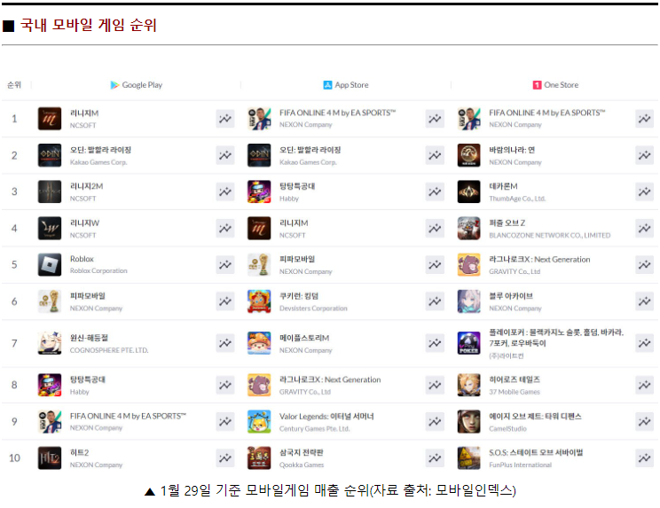 - 지난주부터 심상치 않은 분위기를 보인 '피파 모바일'이 구글 플레이스토어 매출 6위를 기록했습니다. 뿐만 아니라 '피파온라인4M'도 함께 구글 매출 10권 내에 진입하면서 축구 게임의 상승세를 나타내는 한 주가 되었습니다. 지난 월드컵 이후 꾸준히 늘어난 축구에 대한 관심은 물론, 유럽에서 활약하고 있는 한국 선수들에 대한 늘어난 관심으로 인해 앞으로의 행보 또한 기대됩니다.