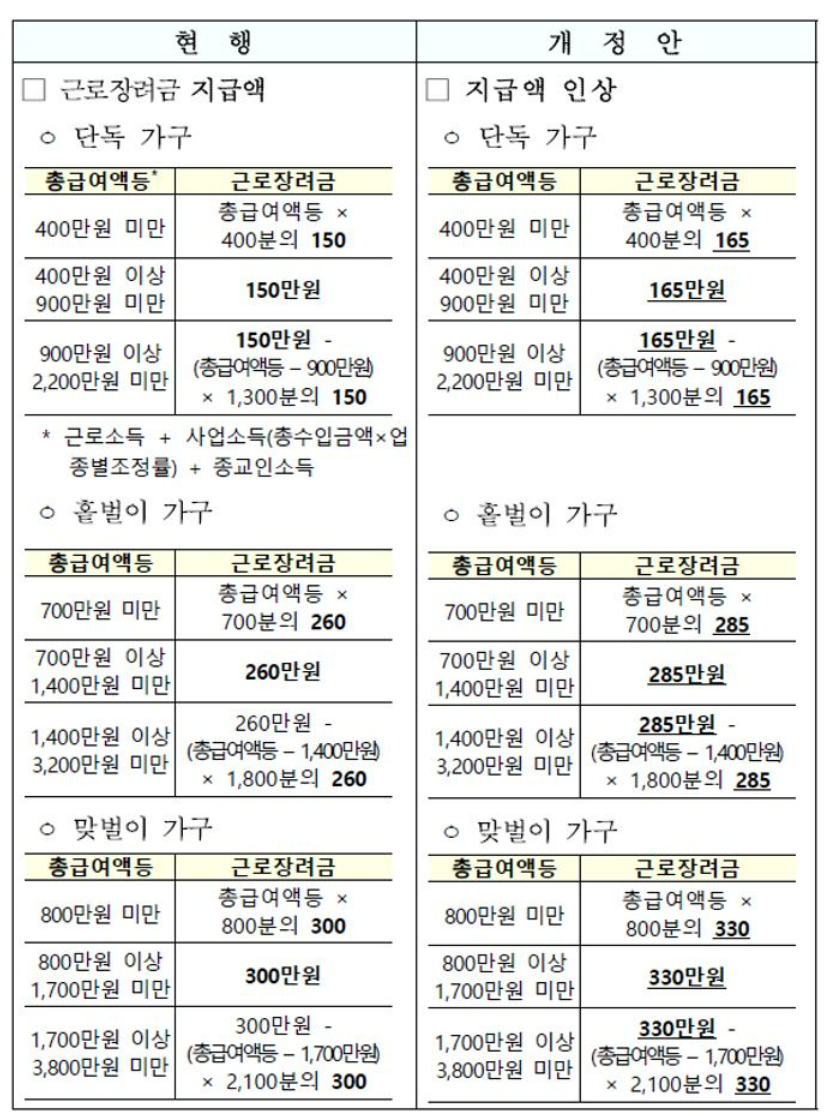 근로 장려금 최대 지급액은 단독 가구 150만 원. 홑벌이 가구 260만 원, 맞벌이 가구 300만 원이 지급되었습니다.
