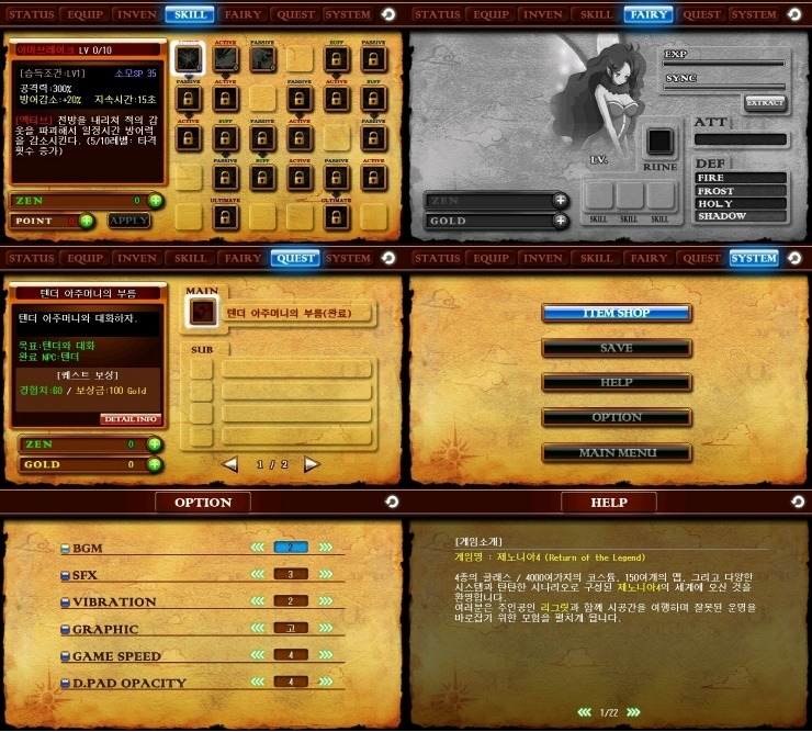 안드로이드 추천게임 제노니아4에서는 전작과 같이 레벨업 할 때 마다 힘, 민첩, 콘, 인트 4가지의 능력치를 3포인트씩 배분해 올릴 수 있습니다. 기본적인 능력치 이외에 젠(캐시)을 통해서도 올릴 수 있는 능력치가 있습니다.