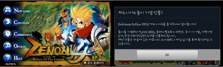 제노니아4를 실행하면 새게임, 이어하기, 커뮤니티, 설정, 도움말을 볼 수 있습니다. 그리고! 제노니아4 출시 기념으로 다양한 선물을 지급하고 있습니다.