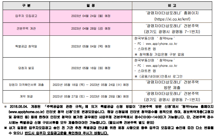 - 특별공급 청약일은 2023년 5월 4일 (목)으로 예정이고, 당첨자 발표일은 5월 16일(화) 예정입니다.