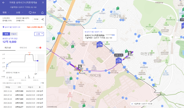 거여 e편한세상송파 파크센트럴은 33평형이 거의 2년사이에 7억대가 올라가는