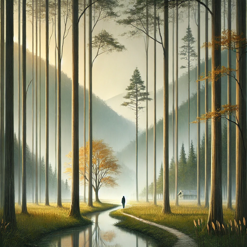 푸른 산빛을 깨치고 단풍나무 숲을 향하여 난 작은 길을 걸어서,