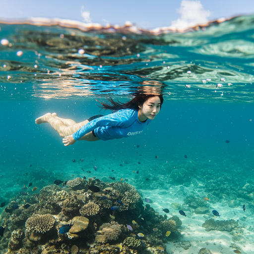 - 샌들/아쿠아 슈즈: 래쉬가드 컬러와 어울리는 샌들이나 아쿠아 슈즈를 선택하여 편안하고 활동적인 룩을 완성하세요.
