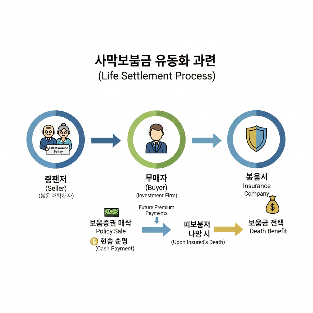 - 핵심 키워드: 사망보험금 유동화, Life Settlement, 생명보험 현금화, 보험증권 매각, 보험계약 양도.