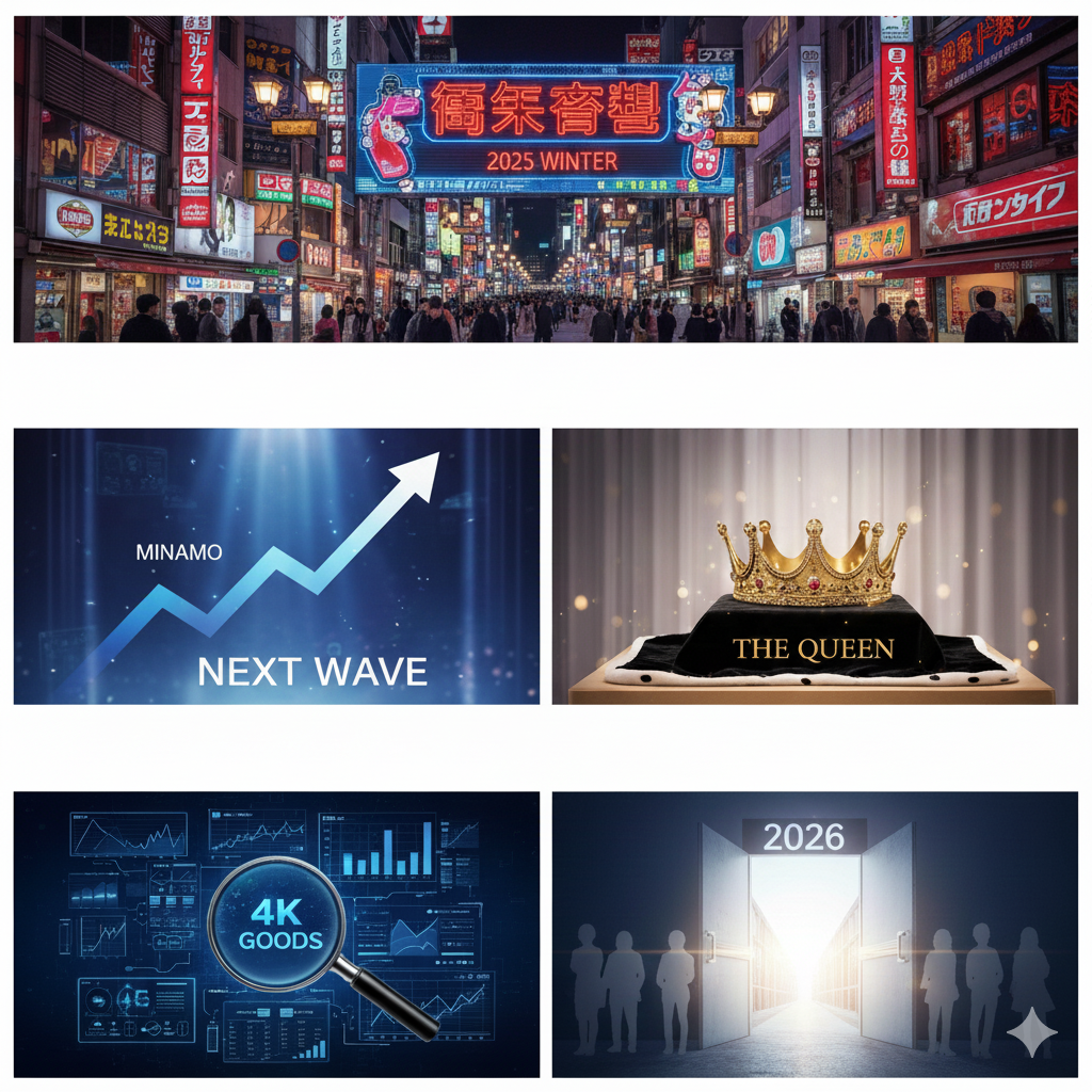 - 미나모의 급성장: 미나모는 2025년 한 해 동안 가장 드라마틱한 성장을 보여준 배우입니다. 특유의 밝고 친근한 이미지로 '옆집 누나' 같은 매력을 어필하며, 20대부터 40대까지 폭넓은 지지층을 확보했습니다. 12월 판매 지수에서도 사이카의 턱밑까지 쫓아오는 기염을 토하고 있습니다.