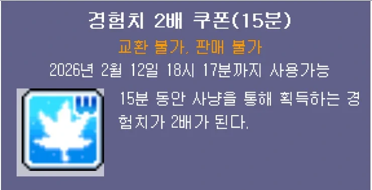 | 복주머니 배달 | 경험치 2배 쿠폰(15분) 2개 |