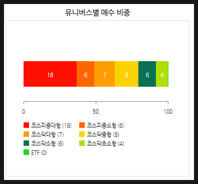 그런데 매수 비중 유니버스를 살펴보면 코스피도 골고루 있었다. 젠포터 사이에서는 이렇게 골고루 매수하는 전략을 무지개떡이라고 하더라. 그런데 왜 코스닥이랑 상관성이 0.74나 되는거지..?