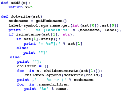 파이썬의 문법에서 가장 잘 알려진 특징은 들여쓰기를 이용한 블록 구조를 들 수 있다. 이것은 보통C등에서 쓰이는 괄호를 이용한 블록 구조를 대신한 것으로 줄마다 처음 오는 공백으로 눈에 보이는 블록 구조가 논리적인 제어 구조와 일치하게 하는 방식이다. 아래는 C와 파이썬으로 재귀 호출을 사용한계승을 계산하는 함수를 정의한 것이다.