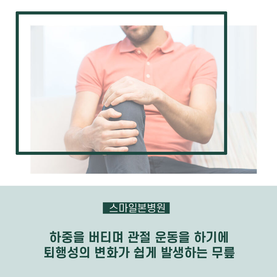 하지만 이런 치료에도 불구하고 개선이 되지 않는다면 결국 무릎 퇴행성 관절염의 치료를 위한 수술적인 치료를 고민해봐야 한다고 하죠. 그러나 수술을 하게 되면 무릎 움직임의 회복을 위한 재활치료까지 진행해야하기에 인내심이 필요한 치료라고 할 수 있어요. 그렇기에 무릎 통증을 경험한다면 조기치료가 중요하며, 평상시 무릎 관절을 무리하게 사용하지 말고 자신의 몸 상태에 맞게 차근차근 활동량이나 운동량을 늘려가는 것이 도움이 될 것입니다. 또한 무릎 관절의 압력이 커지지 않도록 적정 체중을 유지해주시는 것이 좋으며, 운동의 경우 가벼운 걷기가 좋다고 하니 알아두시길 바라요.