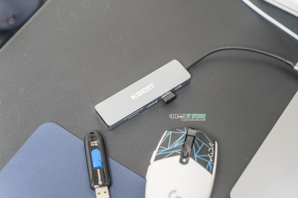 이제 2개의 USB-A 포트가 있기 때문에, 마우스 수신기를 장착하여 활용하는 것이 가능하고, USB 메모리의 경우에도 따로 젠더 필요 없이 바로 연결하여 사용할 수 있습니다. USB 3.0으로 최대 5Gbps 속도를 지원하기 때문에, 파일을 옮기고 지우는데도 문제가 없었습니다.